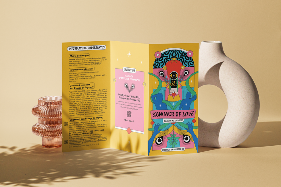 A la manière du festival bien connu "Burning man", l'idée était ici de créer un faire-part festif, illustré et original avec un esthétisme tiré des années 80.